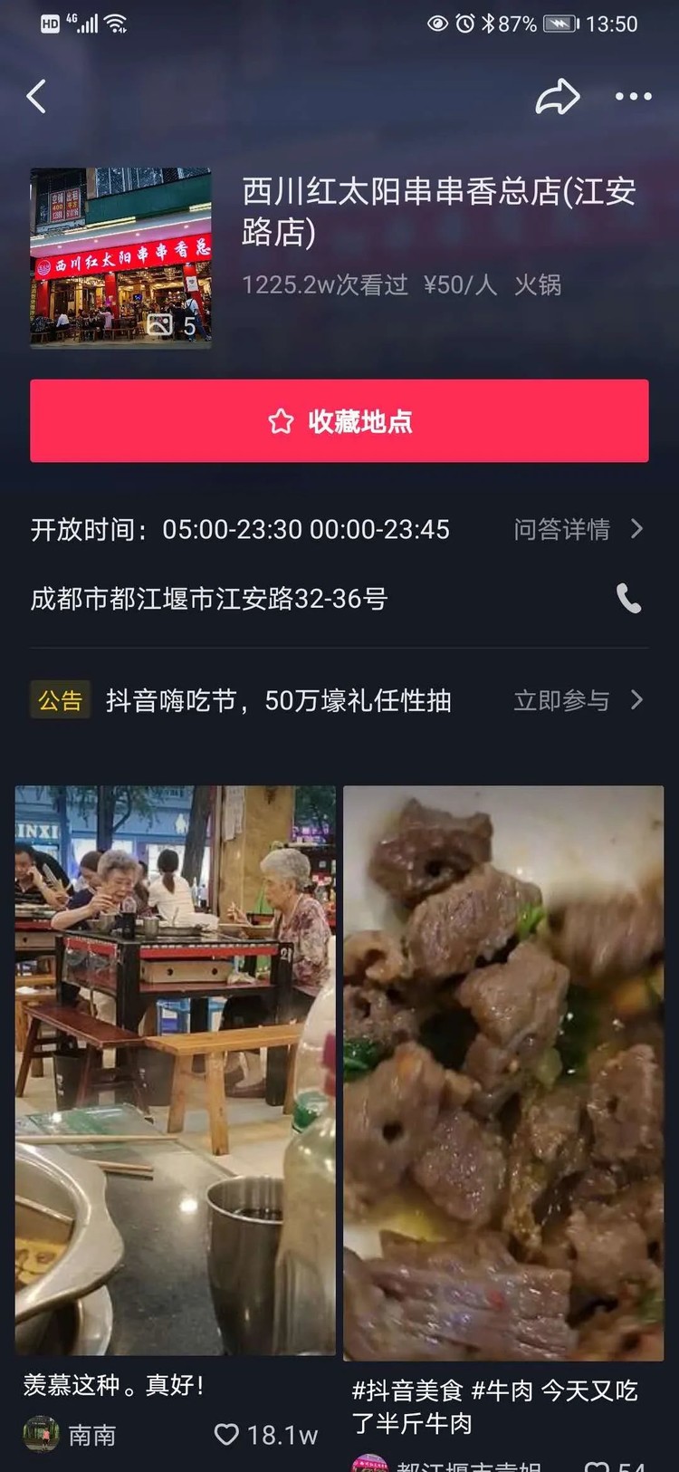 ▲ 例如这个视频,添加了指路人地图标注服务中心铺地址:西川红太阳串串香